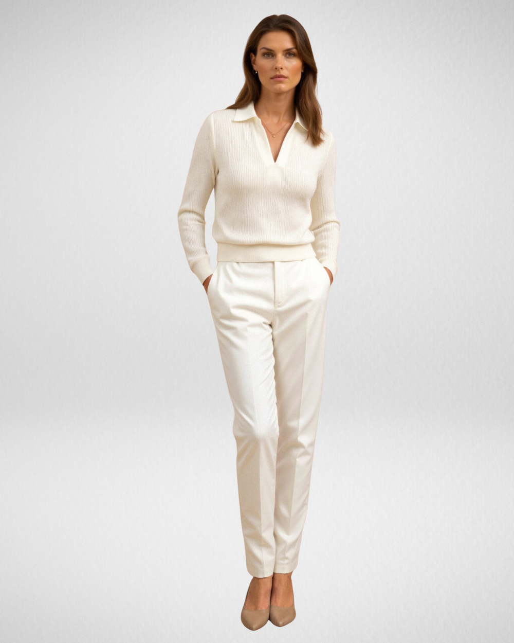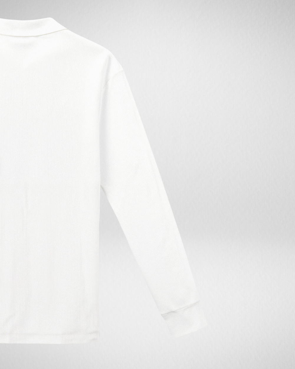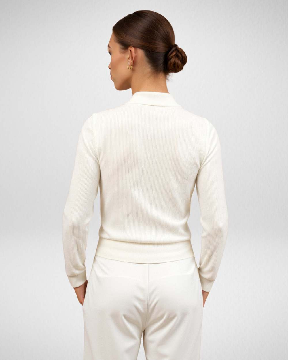 Elegancka i ponadczasowa, ta bluzka polo z długim rękawem łączy minimalistyczny design z najwyższym komfortem noszenia. Klasyczny kołnierzyk i dekolt w kształcie litery V nadają jej subtelny, kobiecy charakter, idealny zarówno do pracy, jak i na co dzień.