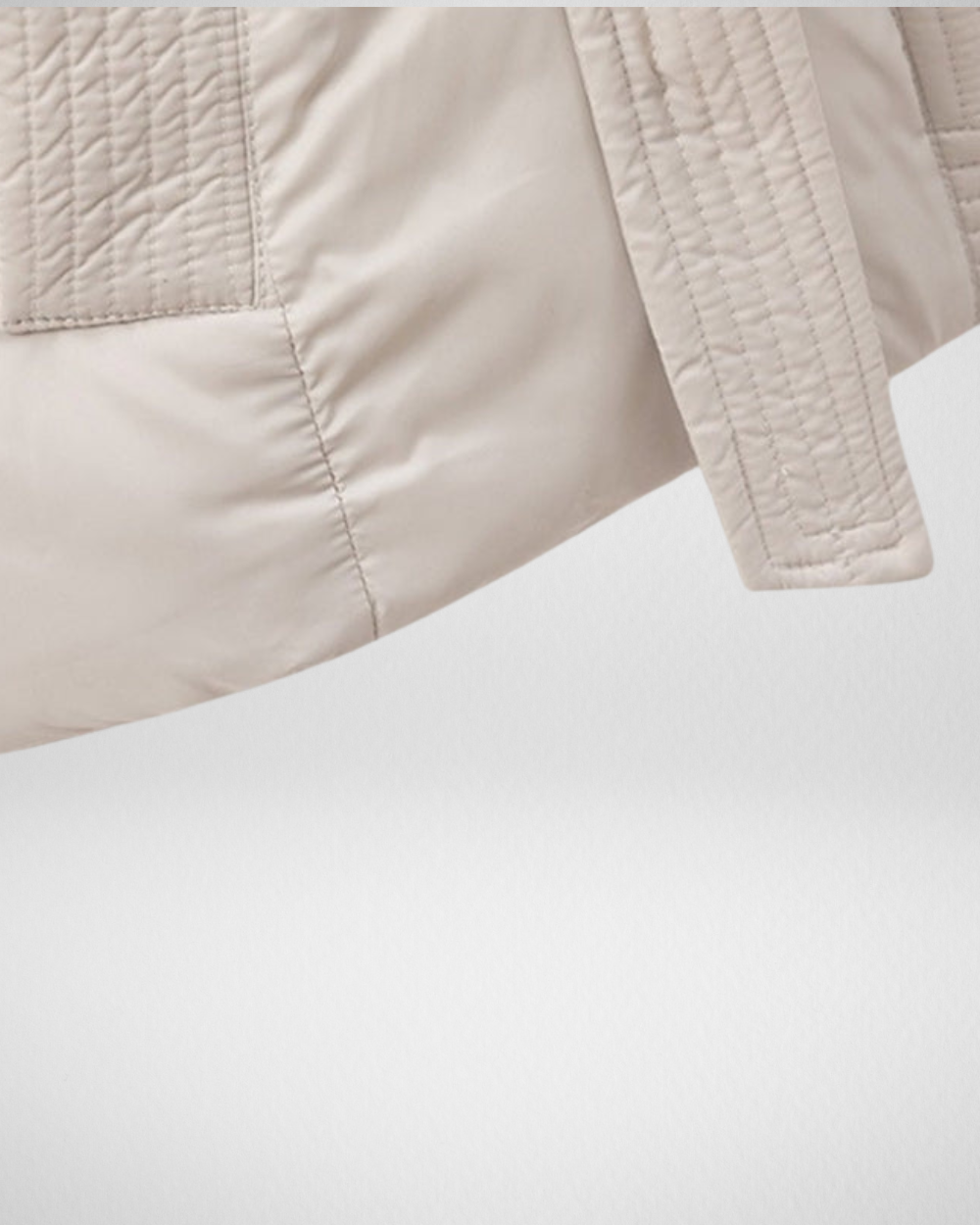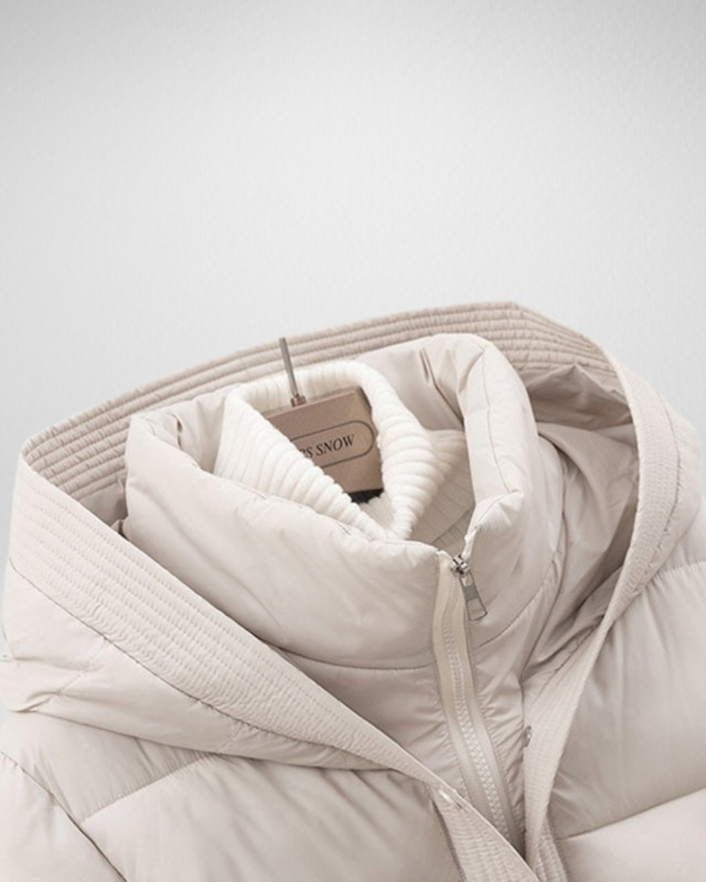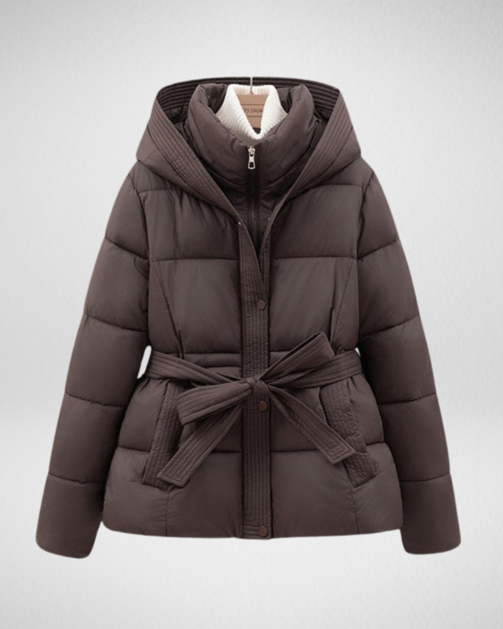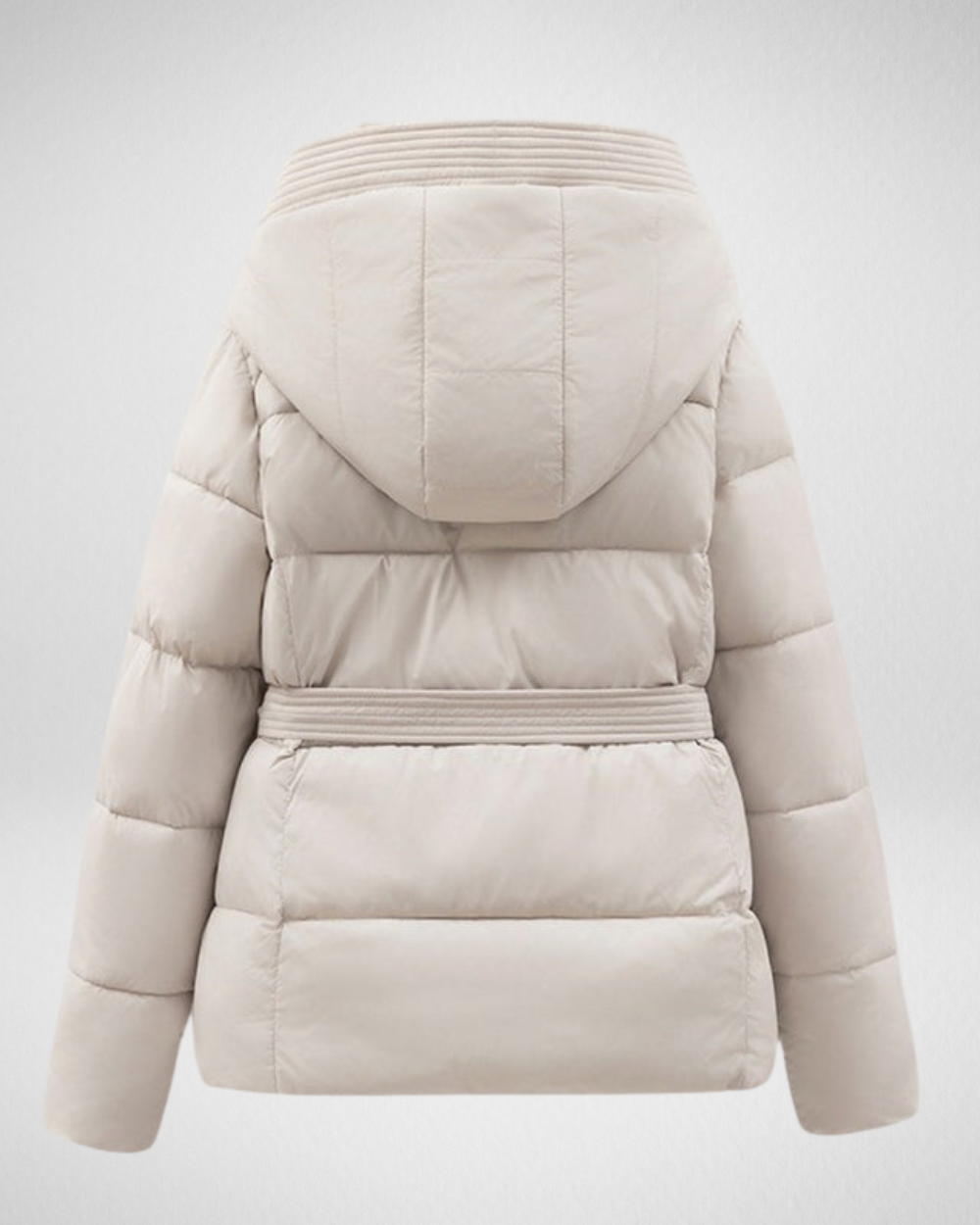 Lekka, miękko ocieplana kurtka zimowa z paskiem, który podkreśla talię i nadaje kobiecy kształt. Kaptur zapewnia dodatkową ochronę przed wiatrem i śniegiem, dzięki czemu świetnie sprawdza się w codziennych zimowych warunkach.