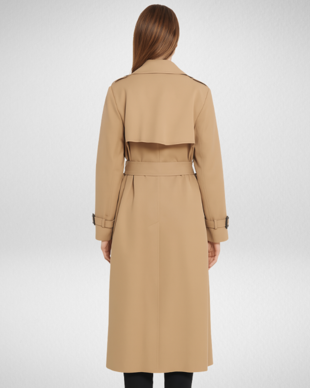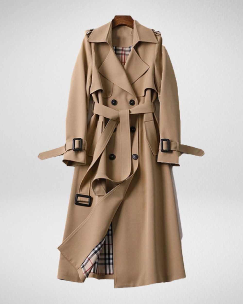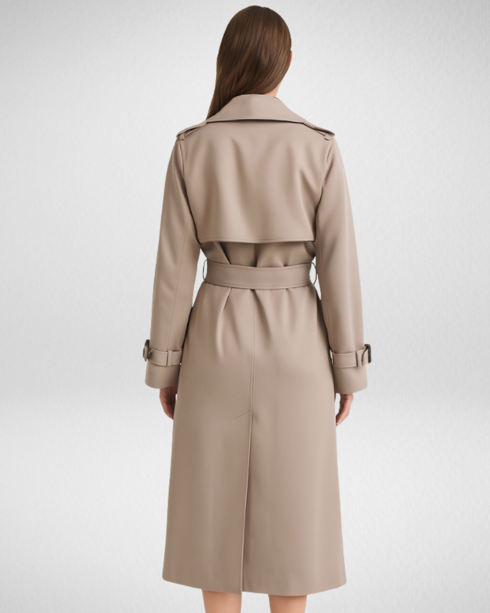 Stylowy i wyrafinowany, ten klasyczny płaszcz dwurzędowy to must-have w kobiecej garderobie. Taliowany krój i regulowany pasek podkreślają sylwetkę, a neutralny odcień beżu nadaje mu elegancji i uniwersalności. Idealny zarówno do biura, jak i na co dzień.