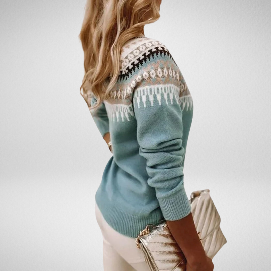 Ten damski dzianinowy sweter z klasycznym wzorem inspirowanym Fair Isle łączy miękkość, ciepło i ponadczasową zimową estetykę. Idealny na chłodne dni, zapewnia komfort oraz elegancki, sezonowy akcent w codziennych stylizacjach.