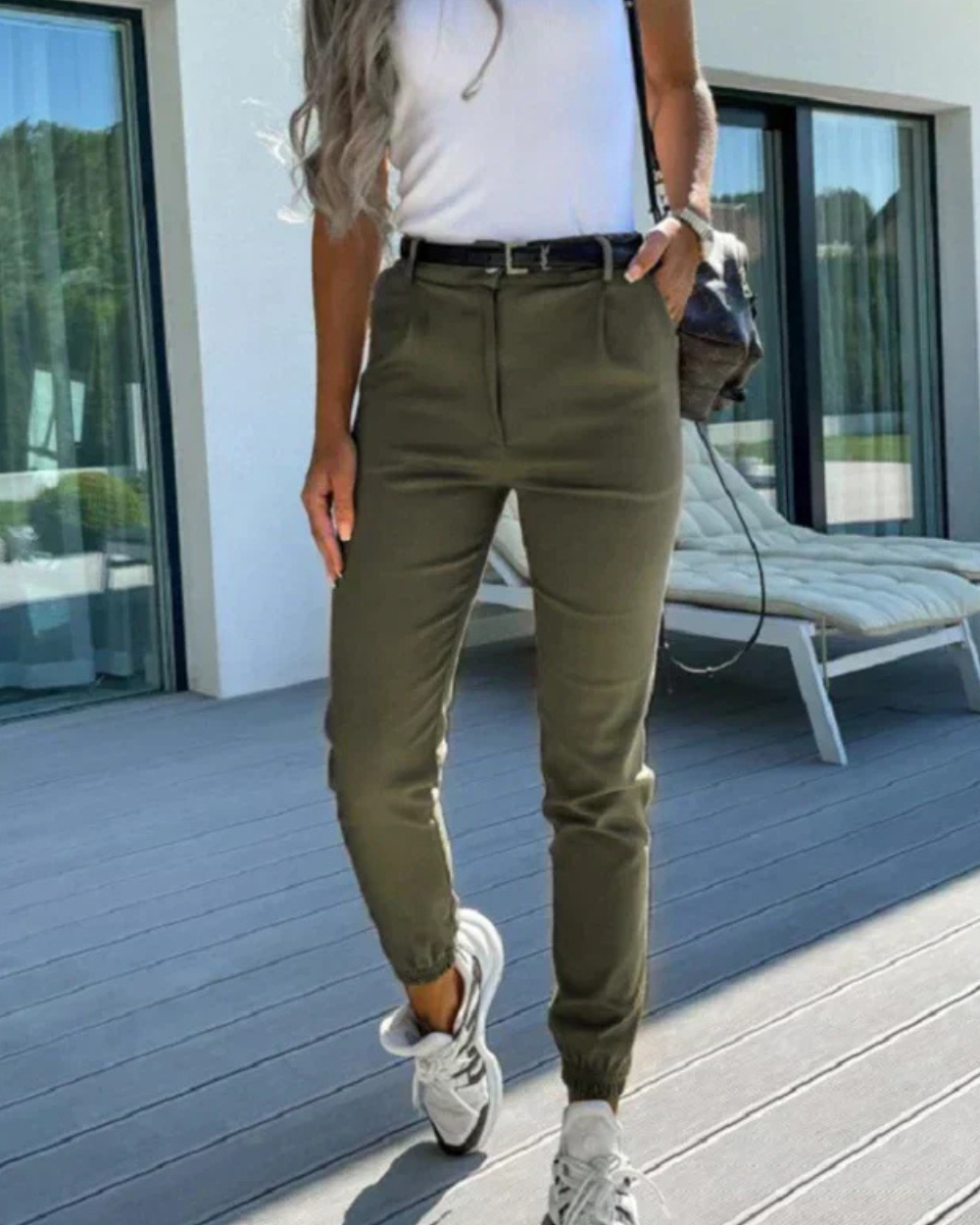 Dopasowany krój: Zwężane nogawki i elastyczny pas podkreślają sylwetkę.