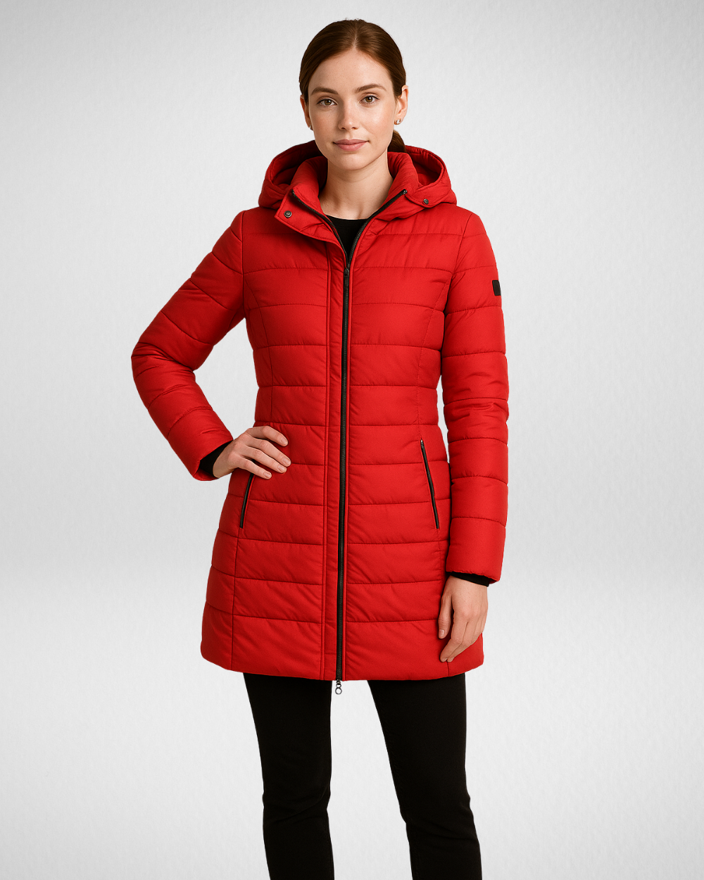 Elegancka, długa pikowana kurtka zaprojektowana tak, by zapewniać ciepło i podkreślać sylwetkę. Lekka, wodoodporna i dopasowana – idealna na chłodne, zimowe dni.