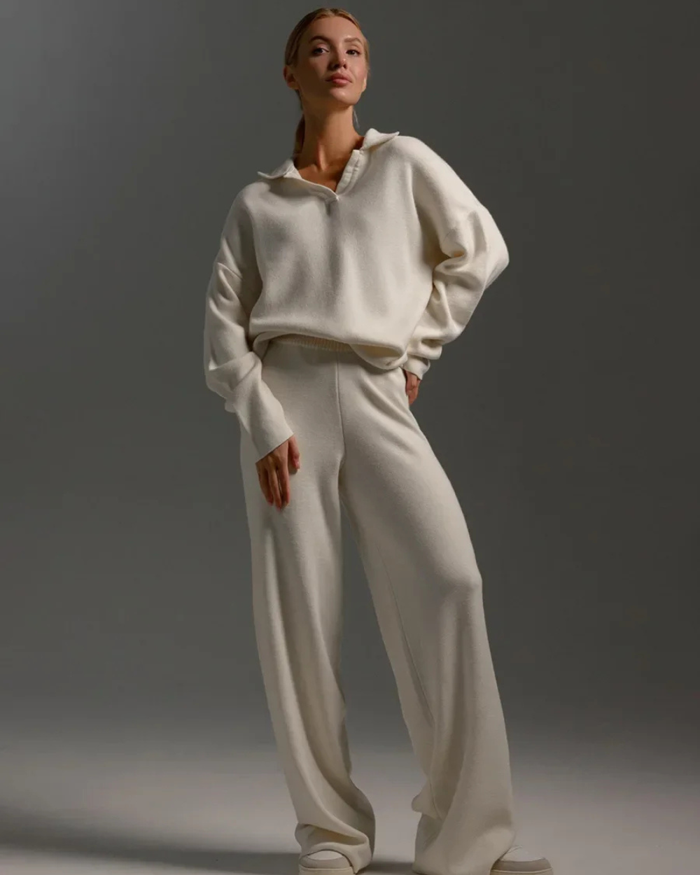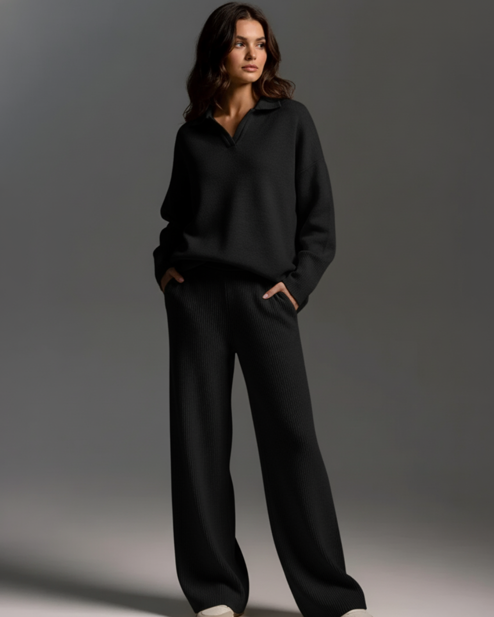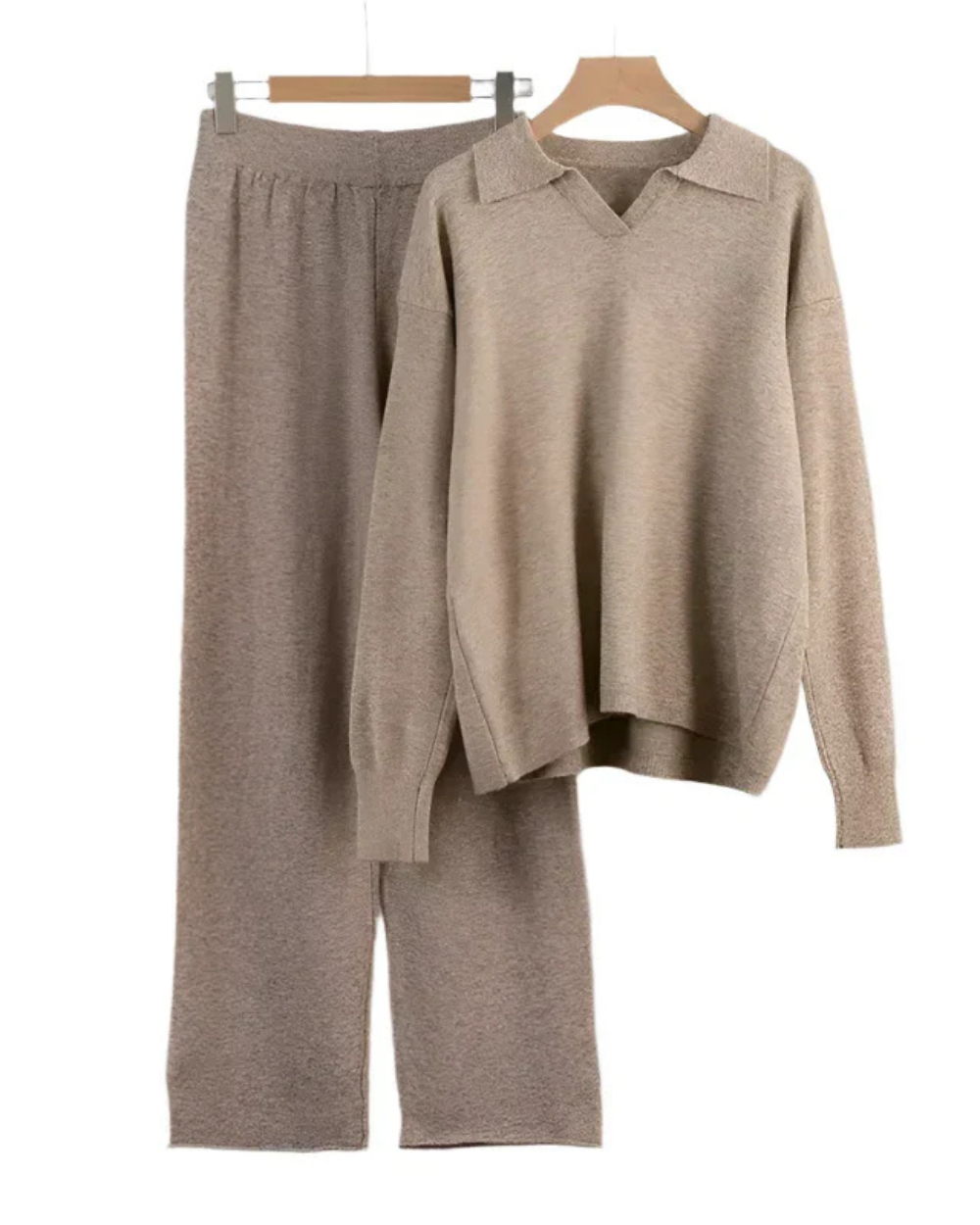 Ten dzianinowy komplet łączy w sobie miękkość, wygodę i ponadczasowy styl. Idealny zarówno na codzienne wyjścia, jak i do pracy czy spotkania z przyjaciółmi. Zestaw składa się z luźnego swetra z kołnierzykiem oraz spodni o prostym, szerokim kroju – tworząc harmonijny, kobiecy wygląd.
