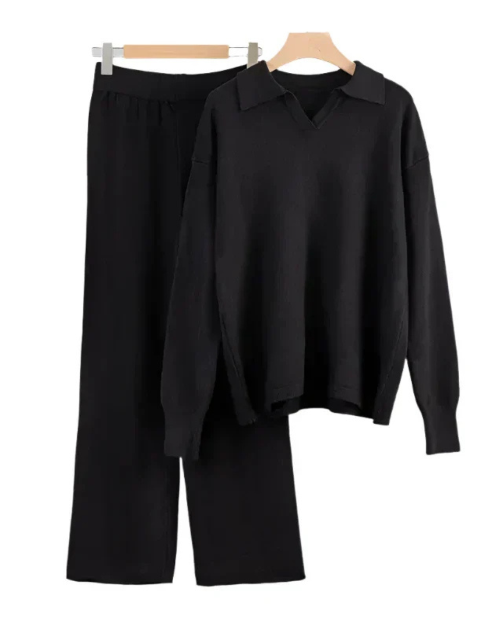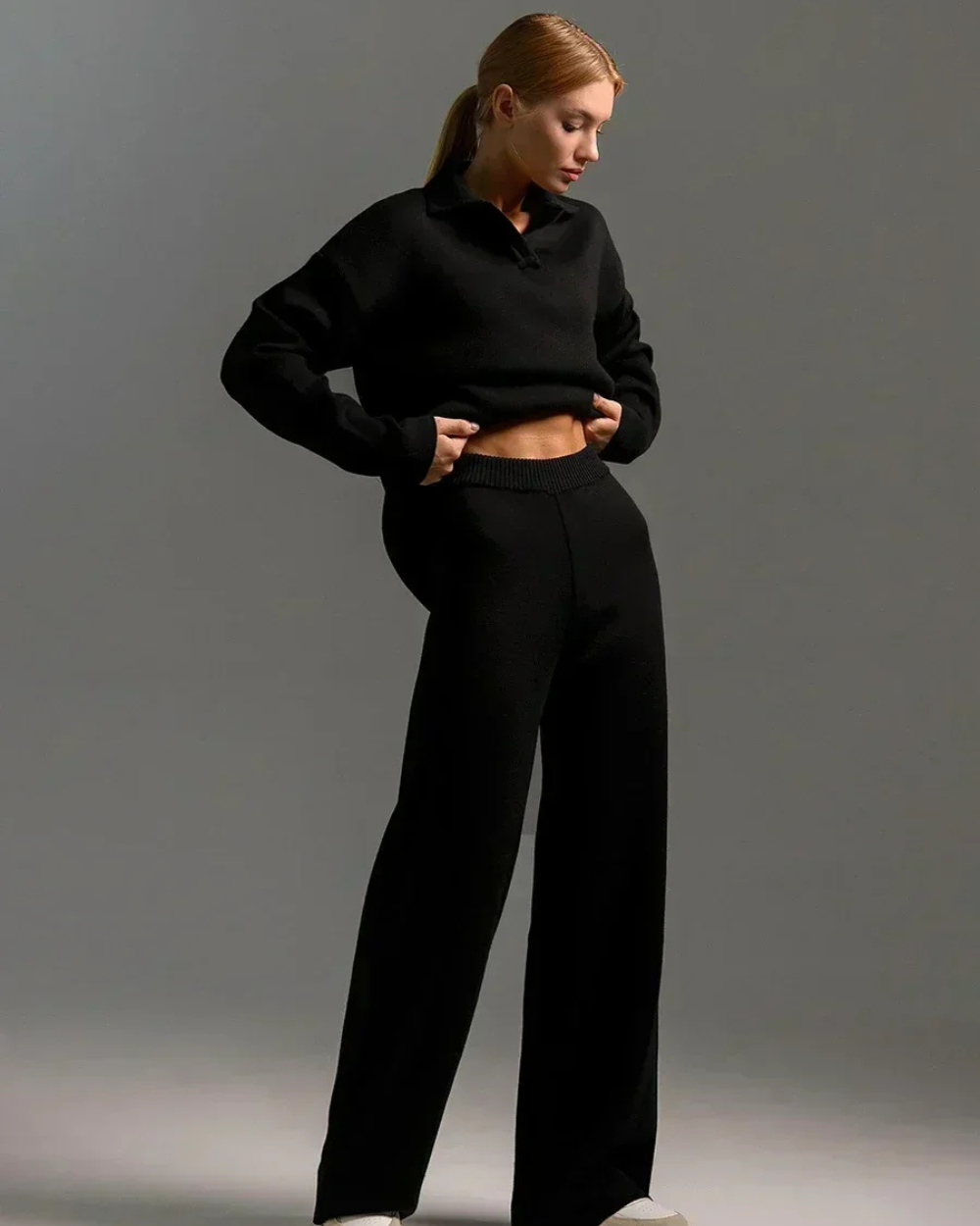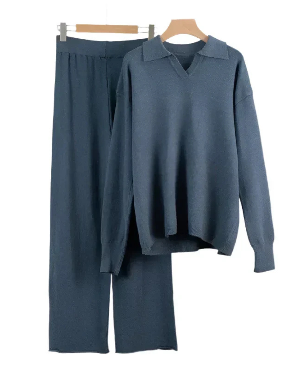 Ten dzianinowy komplet łączy w sobie miękkość, wygodę i ponadczasowy styl. Idealny zarówno na codzienne wyjścia, jak i do pracy czy spotkania z przyjaciółmi. Zestaw składa się z luźnego swetra z kołnierzykiem oraz spodni o prostym, szerokim kroju – tworząc harmonijny, kobiecy wygląd.