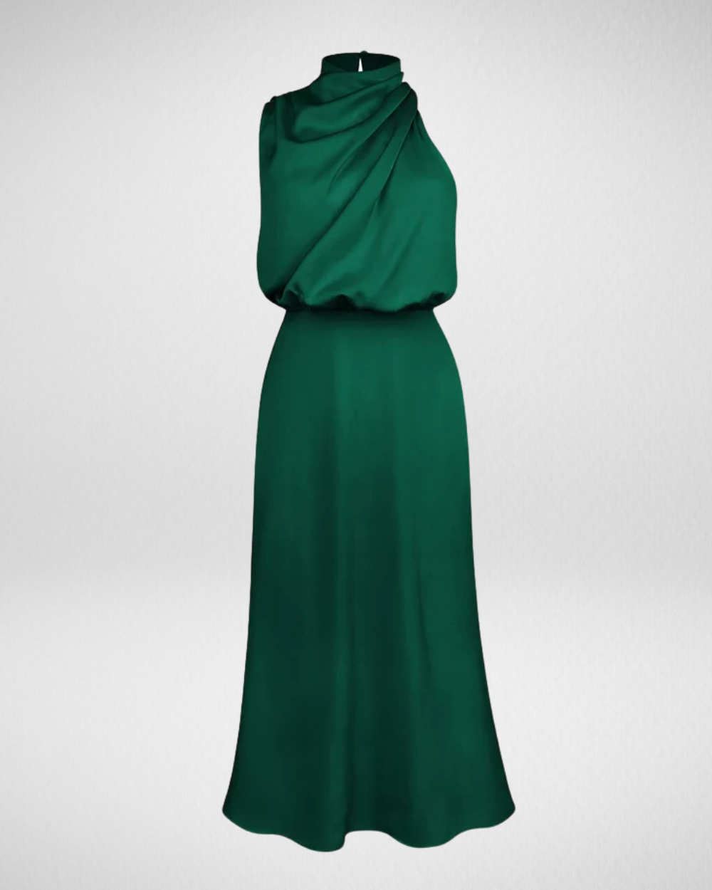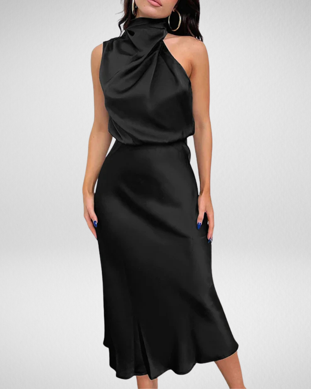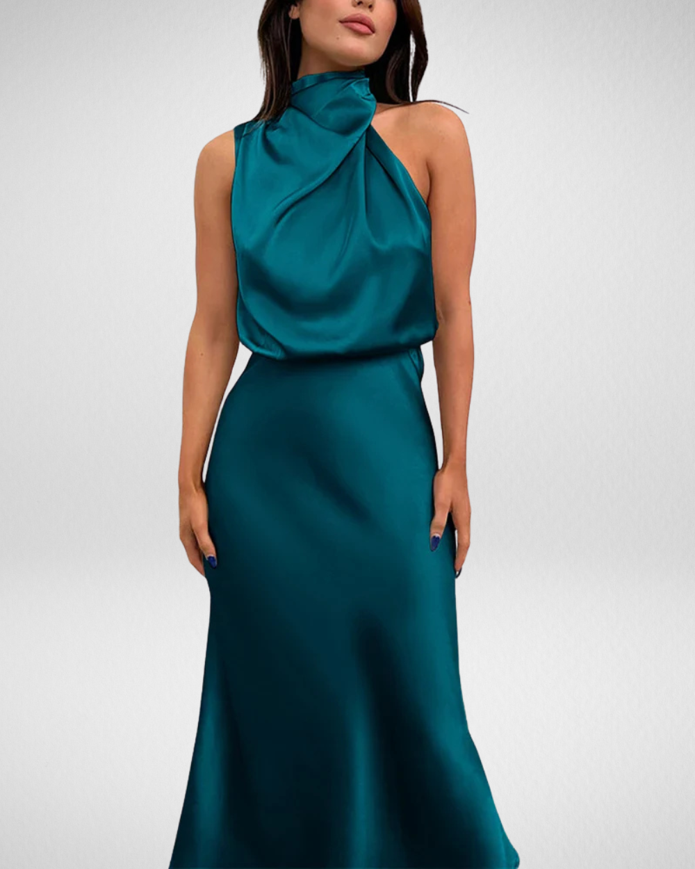 Ta satynowa sukienka midi łączy w sobie ponadczasową elegancję i współczesny minimalizm. Gładka, połyskująca satyna subtelnie otula sylwetkę, a asymetryczny dekolt dodaje jej wyjątkowego, nowoczesnego charakteru. Idealna na uroczyste okazje, przyjęcia, wesela i wieczorne wyjścia.